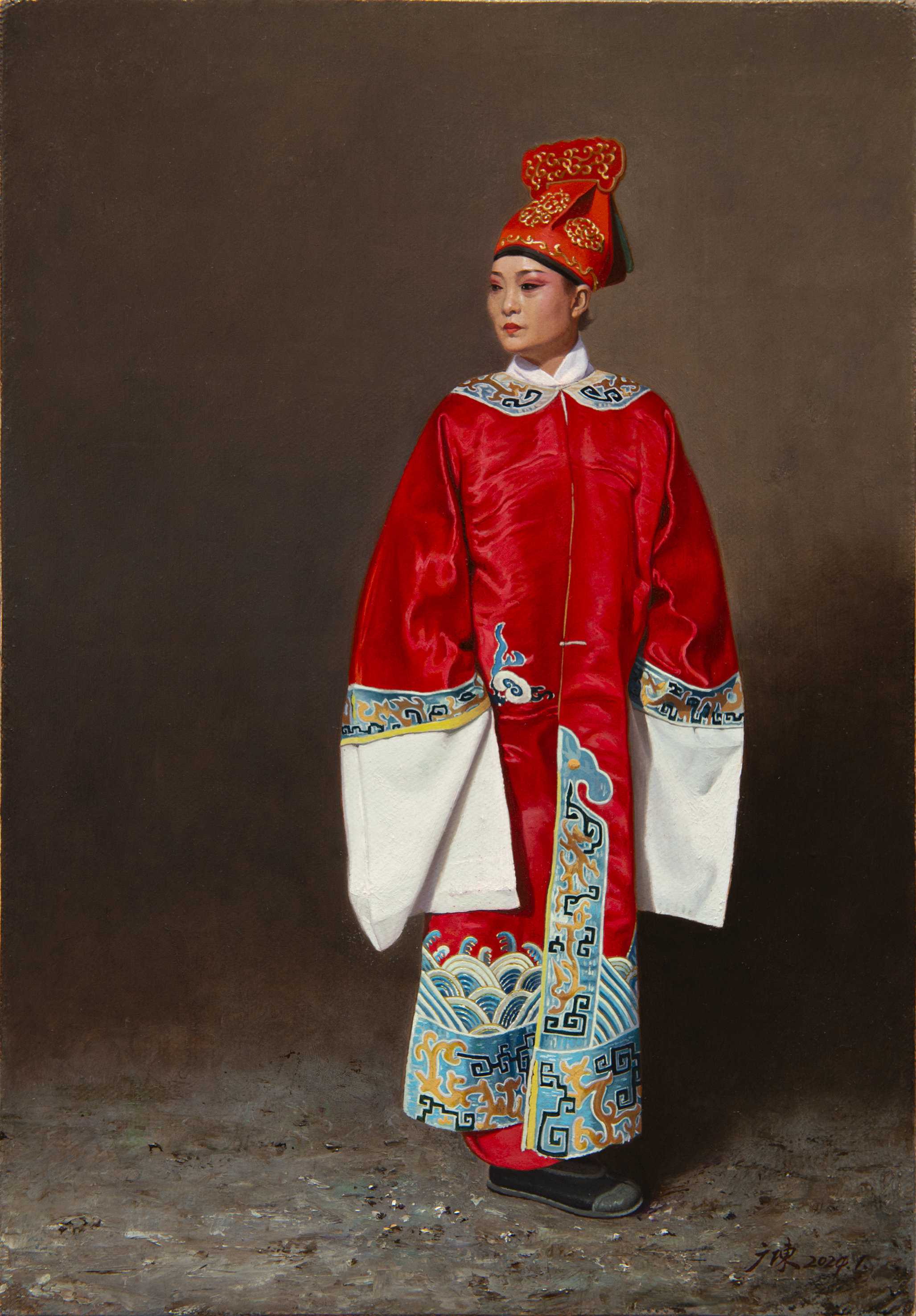 创作札记:《告庙》这张作品以传统戏曲剧目《打神告庙》中的人物为创作素材,在创作过程中我试图用逆光来表达人物精致优雅的动态美。轮廓线与边缘线在相当多的区域重合在一起,这种光线的变化是我要表达的重要方面。画面中绿、红、黑、白四个色块的对比关系,在程度上的把握比较困难,这让我想起了荷兰小画派中维米尔的小幅作品。我想:经典的写实艺术是穿越时空的永恒存在。更是吾辈终其一生之所求!