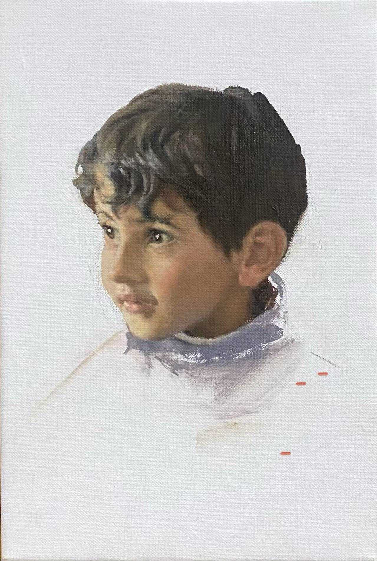 创作札记:少数民族题材曾一度风靡各类大型美展,也使得新疆、西藏、云南等边陲偏远地区一度成为画家们神往之地。而擅长此类题材的画家也不在少数。在风格方面,上述画家的作品既有现实的,也有唯美的,而用古典写实手法来进行创作的却较少。而这也正好是我一直以来所探索的主要方向。鉴于此,在创作此系列小幅人物肖像作品时,我注重从两点入手:1.造型语言的精准概括。我主要以17至19世纪的古典主义绘画大师的肖像作品为范本,努力发掘传统古典绘画的材料技法和审美格调中蕴含的价值。为此,我努力推敲人物的结构造型,并将画面色彩尽量统一起来,以中性色贯穿整个画面。2.尽量让画中的人物角色贴近生活。为此,我不带先入为主的意识来选择模特儿,而是通过数次的下乡采风、写生等方式来发现自己感兴趣的切入点,这些作品中人物的精神状态和环境都是在真实记录事实 的基础上整理而成的,故而,这些作品能够很好地避免戏剧化和过分夸大的艺术处理方式。总之,我的新疆题材系列作品并非简单的所谓“异域风情”,而是要在这个有着独特地域文化的地方发现更多有积极意义的,能够彰显出人性光辉的艺术题材。