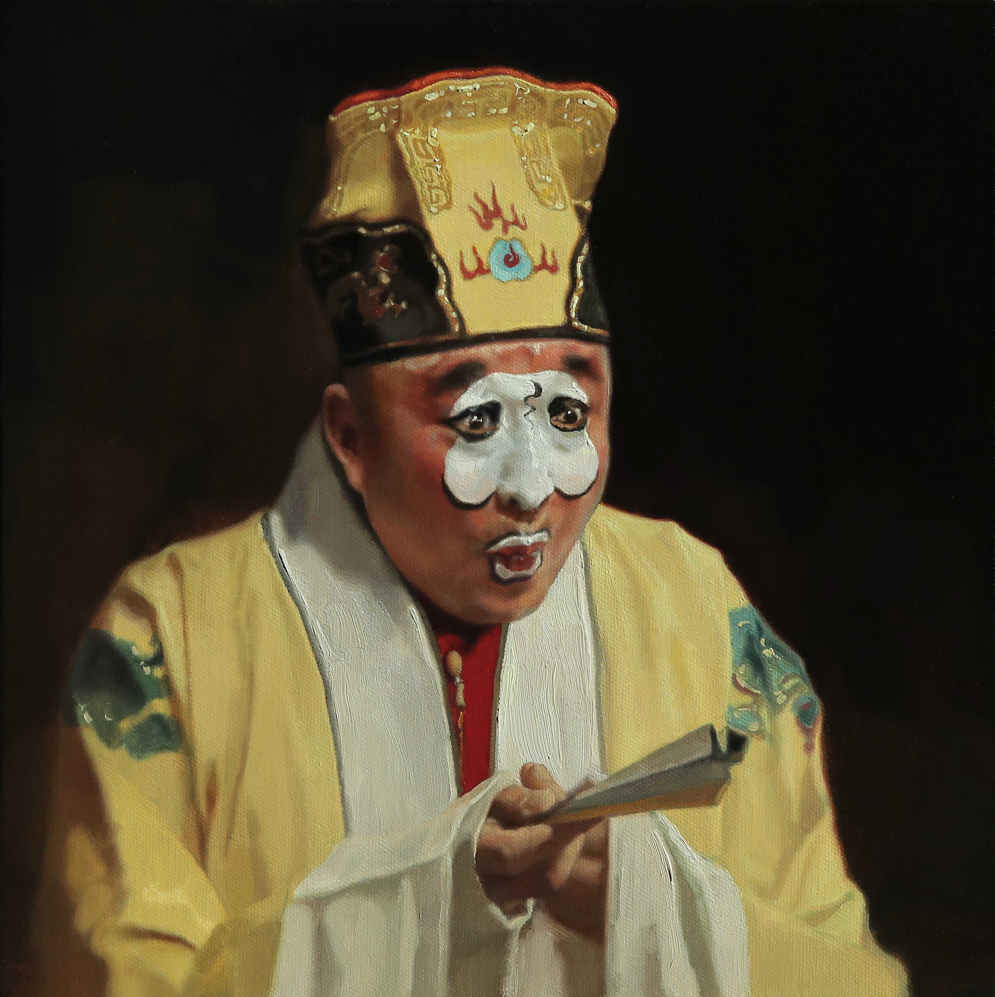 创作札记:《丑角儿》这张作品取自京剧《凤还巢》中的一个人物角色,模特儿是一个丑角的角色。丑角在形象上、在面部表情的表演上更是精彩绝伦,我力图抓住丑角在舞台上的一瞬间的形象表达进行油画艺术表现。人物的着装是明黄色的段子戏服。在色彩表达上具有强烈的黄黑对比关系。创作过程中,不时的在脑海中回想起王沂东老师红黑系列的人物创作及创作理念,在细节表达上舍弃了繁多的刺绣纹样,来突出黄色块整体的视觉冲击感。
