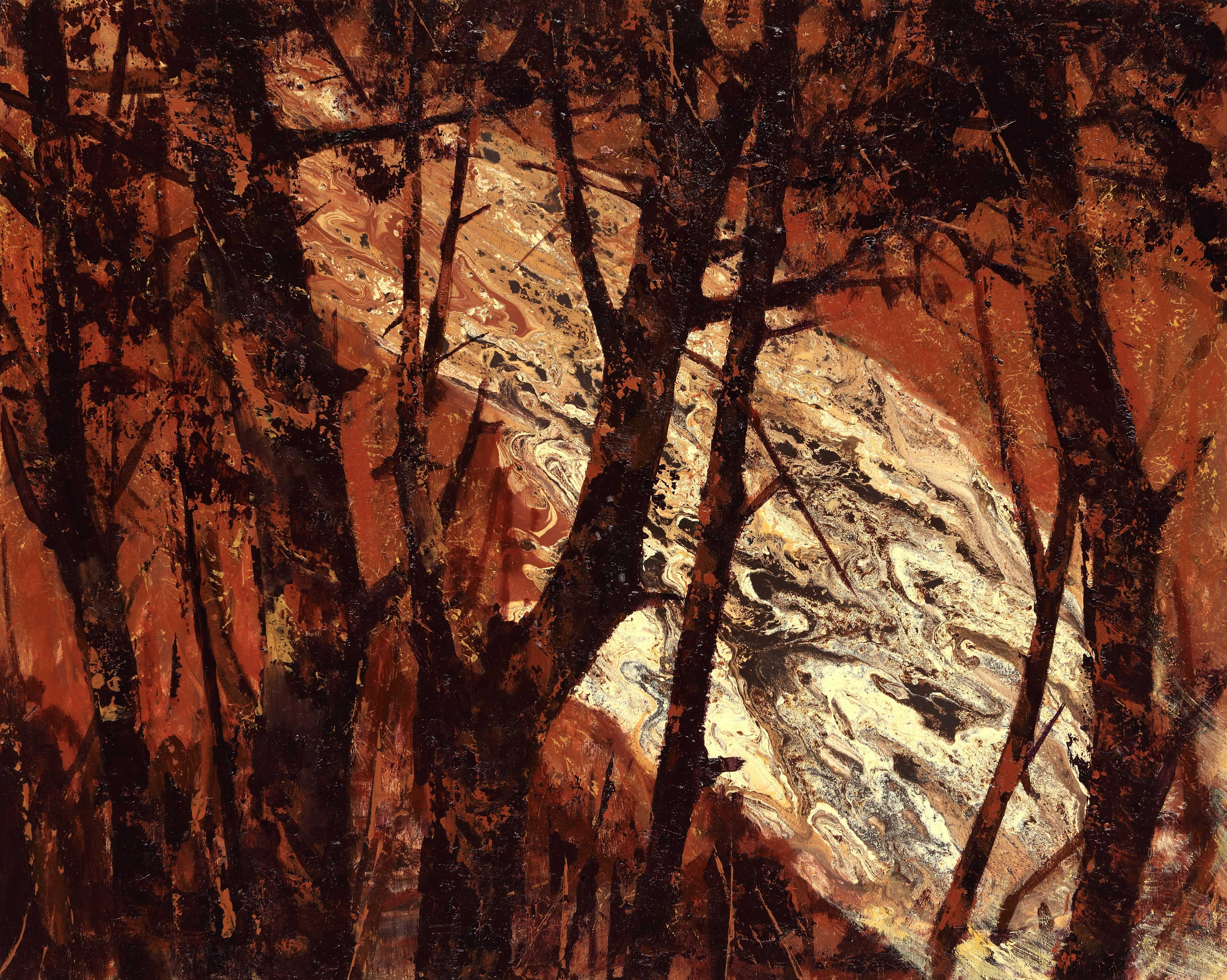 创作札记:在《涟漪》这幅作品中,我试图通过浓烈的橙红色调和深邃的暗影,呈现出一种自然的生命力与流动感。画面主体是树木的剪影,交织的枝干将视线引向中央,那片如流水般起伏的明亮区域象征着时间的涟漪和自然的律动。橙红色的背景不仅突出了热烈与生命的力量,也暗示了大地的温暖与光辉的深邃交融。