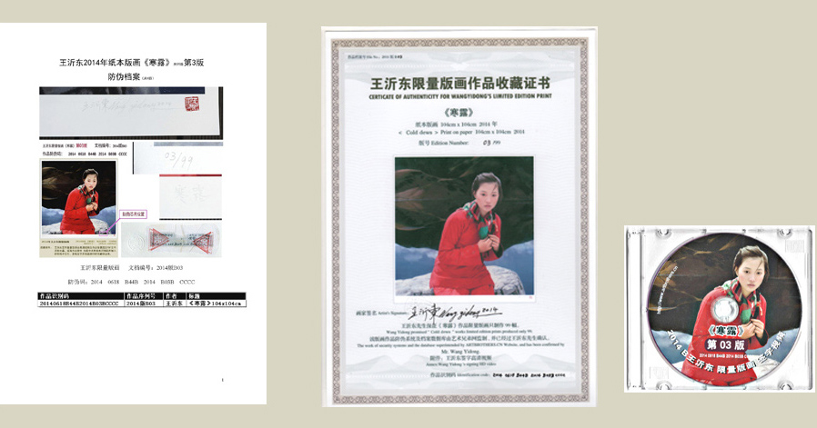 | 2014年王沂东限量版画 | 保真附件: | 王沂东签字盖章现场多机位全高清视频及作品背景图文PDF文件资料光盘。版画作品原件加载中央数据库识别码并植入防伪电子芯片。亲笔签字并加盖钢印的收藏保证书,及防伪图鉴档案印样。 |